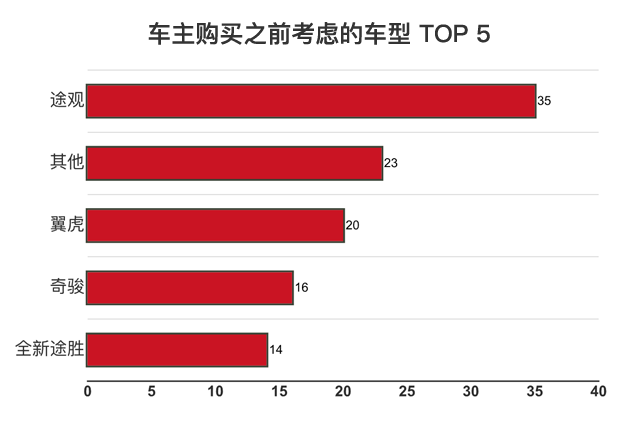 当然这只能放到以前来说,但现在这个“其他”却可以包含更多的竞品,比如新上市的探界者、柯迪亚克,以及刚上市的标致5008等。排名第三的则是长安翼虎,同是美系车型,价格也有一定的重叠度,会跟着一块考虑也是正常的。