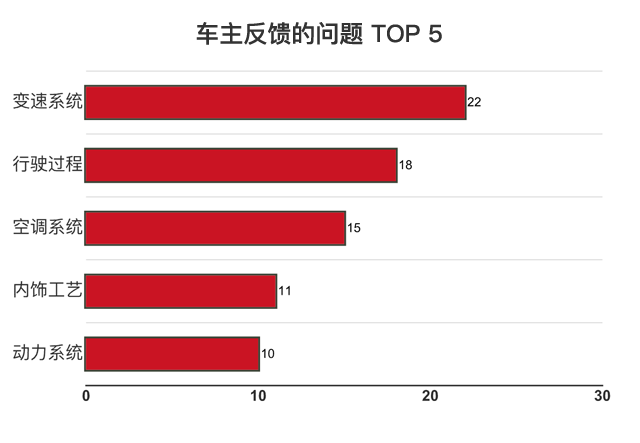 排名第二的则是行驶过程中刹车偏软的问题,此外还有小部分车主反馈车子前部异响、怠速时有抖动等。