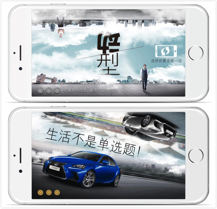 提示:向上或向下倾斜转动手机,选择进入不同世界,收集勋章赢大奖。点击“试驾抽奖”填写信息,有机会赢取雷克萨斯原厂精美礼品。