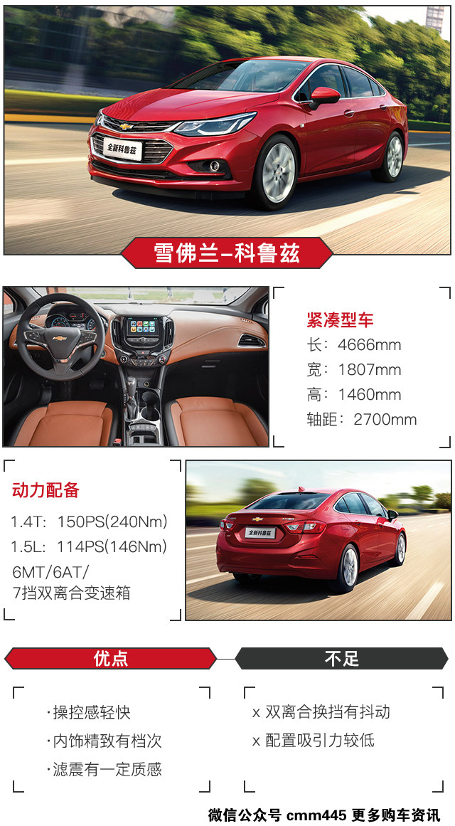 全新一代科鲁兹可谓是成功完成“瘦身”,外观设计上具有浓浓的美系车风格,精致时尚。乘坐空间不再是我们印象中顶脚了,宽敞了许多,带来不错乘坐体验。低配车型搭载1.5L发动机,动力表现很平稳,并不会给你跟强加速感受,匹配6AT变速箱保证了平顺性,适合追求性价比的消费者。如追求动力较强,可以选择1.4T车型,整体表现不错,匹配7挡双离合变速箱,在平顺性表现是不如1.5L车型。