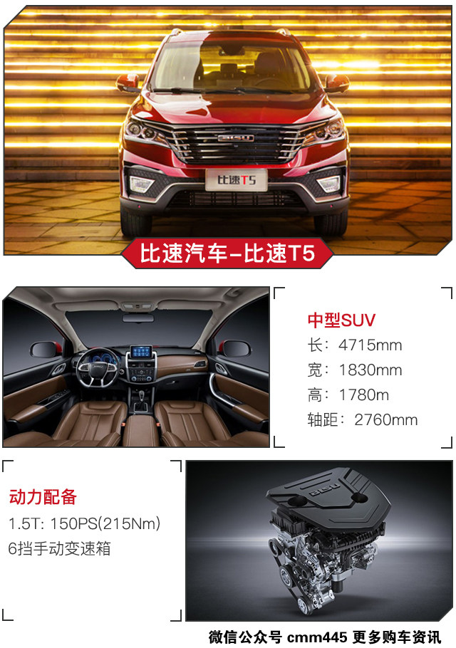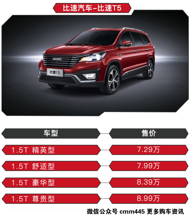 面对现今二胎政策开放,大部分消费者都更青睐7座SUV车型,主要是为了能满足多人出行。2017年6月7日,比速T5正式上市,一款定位于7座中型SUV,售价为:7.29-8.99万,价格比关注度极高的东风风光580还要低,不到9万元就可以买到顶配车型,能看出比速T5势必要在这细分市场中获得一席之地。