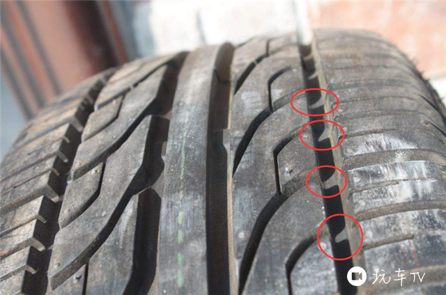 轮胎沟槽底部会有一个磨损标记,提醒你如果轮胎花纹磨损到低于这个位置,就必须要更换轮胎了,如不更换,轮胎的排水能力降低,车辆抓地力降低,容易出现失控打滑的情况。