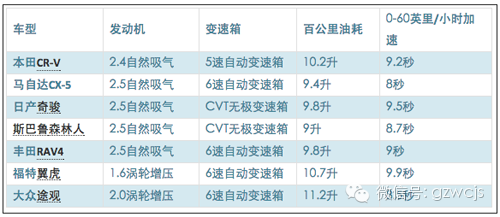 紧凑型SUV里,表现最差的是翼虎1.6T,油耗最高,加速最慢。CR-V、奇骏和RAV4表现比较中庸,油耗和加速都处于中等水平,不好也不坏。途观2.0T加速不错,但油耗最高。紧凑型SUV中表现最好的依然是自然吸气车型——森林人和CX-5,森林人油耗是最低的,加速也不错,CX-5加速最快,油耗第2名,所以紧凑型SUV组的胜负也很显然——自然吸气再下一城。