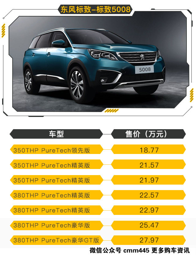 日前东风标致旗下首款7座中型SUV--标致5008正式上市了,此次它推出了350THP(1.6T)、380THP(1.8T)两种动力车型并且提供5座或7座车型让消费者选择。