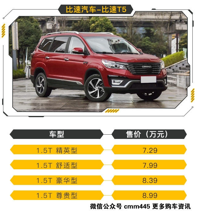 比速汽车首款中型SUV——比速T5也正式上市了,它搭载1.5T+6MT的动力组合,最大功率为150马力,峰值扭矩达215牛米,在后期还将推出自动挡车型。并且厂家宣称购买T5的前两万名车主还将获得终身免费质保。
