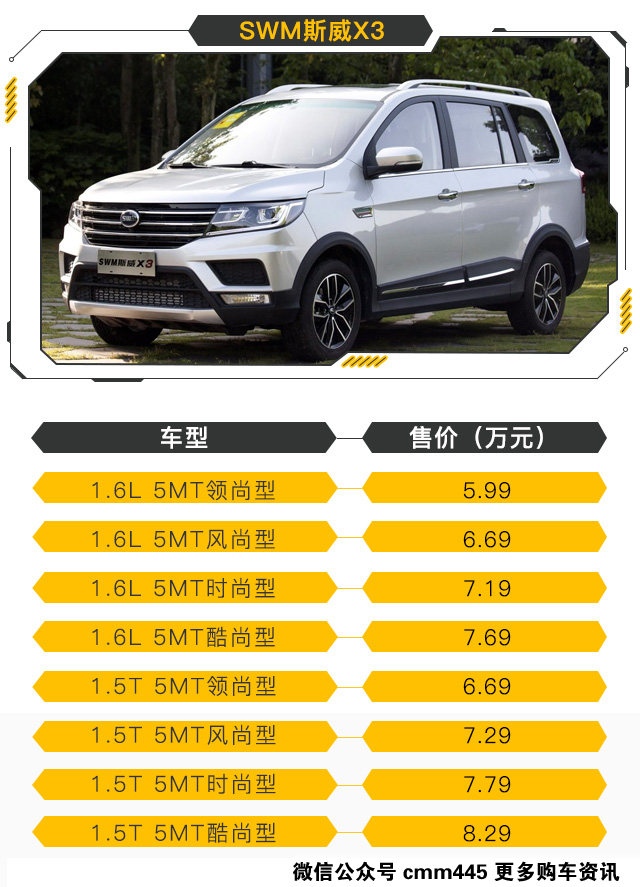 在2017重庆车展上,SWM斯威汽车旗下的首款紧凑型SUV车型——斯威X3也正式上市了,新车将采用1.6L和1.5T两款发动机,并匹配5挡手动变速箱。其售价区间仅为5.99-8.29万元,在定价方面有一定吸引力。