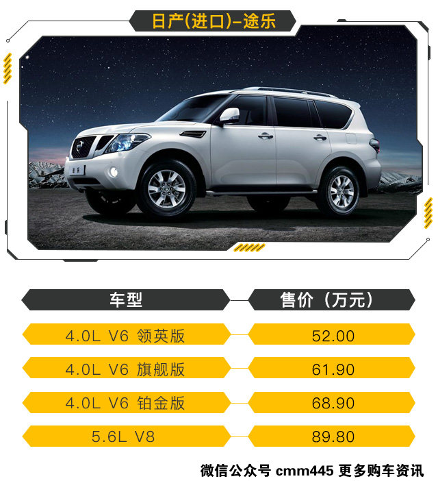 近日,日产途乐4.0L V6车型(车型代号Y62)正式上市了!该车型让途乐的入门售价一下子下降至52万,要知道途乐要对标的车型是丰田的兰德酷路泽,这样的定价让它具有较大优势!