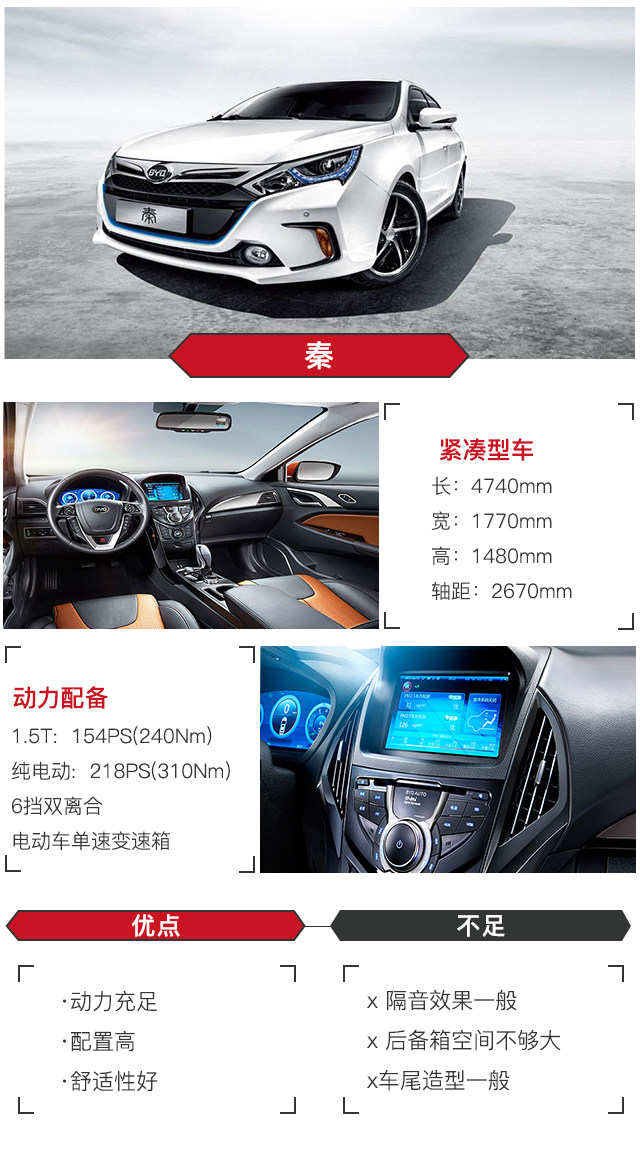 秦配备的1.5T发动机和电动机组成的插电式混动系统是打响江湖的第一炮,百公里加速仅为5.9秒,技术同级别相比较为成熟,稳定性也不错。自主研制的双离合变速箱响应以及换挡平顺都可圈可点,再加上不差的底盘质感,舒适性能够保证。而作为一款混合动力车型,它的百公里油耗不到2L(理想工况下)。