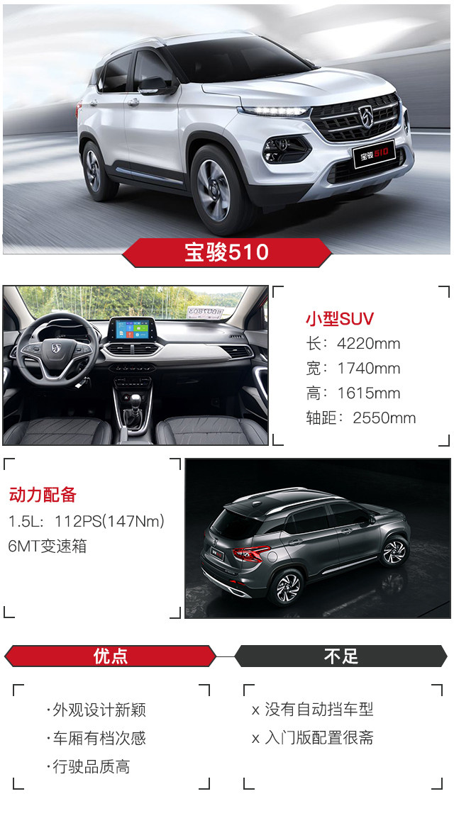 宝骏作为上汽通用五菱旗下较新的品牌,510是最近的拳头之作,作为一款售价不到7万的SUV却有着丝毫不廉价的内饰,而且外观设计新颖,受到年轻人的青睐一点也不奇怪。一档起步可能稍慢,但动力整体表现不错,变速箱顺滑,油耗低,配置高,可以说是在8万内最好开的手动挡SUV了。也可以看见其满满的诚意,同时它造车水平的飞速进步不得不让人惊叹。