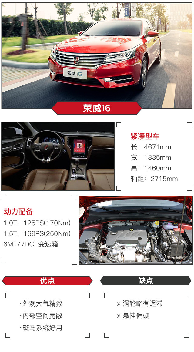 如今的荣威车型不仅在设计上更加顺应中国老百姓的喜好,而且在机械水平上也有十分大的进步,搭载1.0T、1.5T两款发动机,配合6挡手动和7挡双离合变速箱,动力输出充足而平稳,燃油经济性也较好。而高大上的斑马系统将逼格瞬间提升了好几个档次,互联网功能很强大、科技感十足!并且荣威i6还有着自主车所共有的高配置、大空间等特点,可以说它已经成为自主品牌的一面旗帜了,对那些合资车应该也是无所畏惧的。