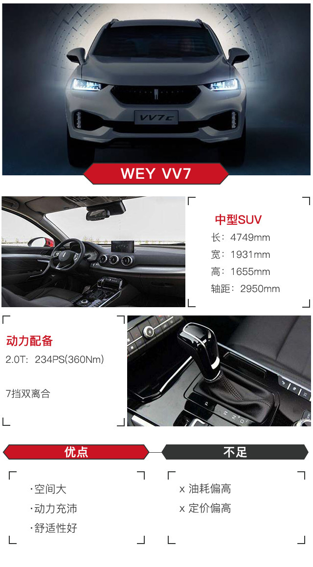 如今长城的高端品牌WEY发布,第一款车型VV7凭借着媲美豪车一般的驾乘质感、帅气的外观以及诸多高端配置吸引了国内外的热切关注。分为VV7s与VV7c两种款式,搭载2.0T发动机、7挡双离合变速器,动力充沛而平顺。轴距长达2950mm,空间表现性好。全系标配12.3英寸数字虚拟仪表盘,总而言之就是高端大气上档次。