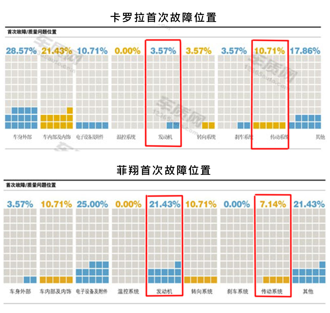 但有时候更高的性能意味着机械部件要承受更大的压力,在车质网的数据中我们可以见到,车主对菲翔的发动机的投诉量明显比卡罗拉要多。所以卡罗拉虽然开得没有菲翔快,但动力输出平顺、发动机的维修率低,两者也算是各有优势的。