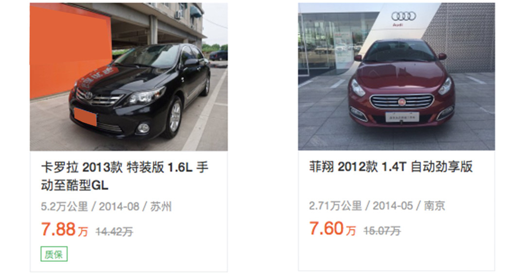 上面是来自某二手车网站的信息,2013款的卡罗拉,2014年8月上牌,跑了5.2万公里,二手车的价格大概为新车的54.6%,而2012款的菲翔,2014年5月上牌,只跑了2.71万公里,价格就已经跌到新车的50.4%。