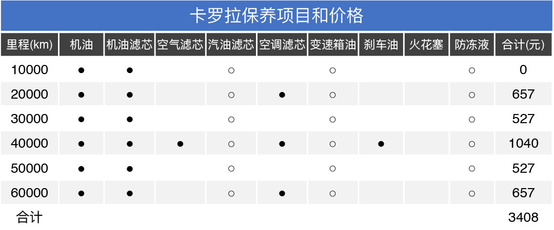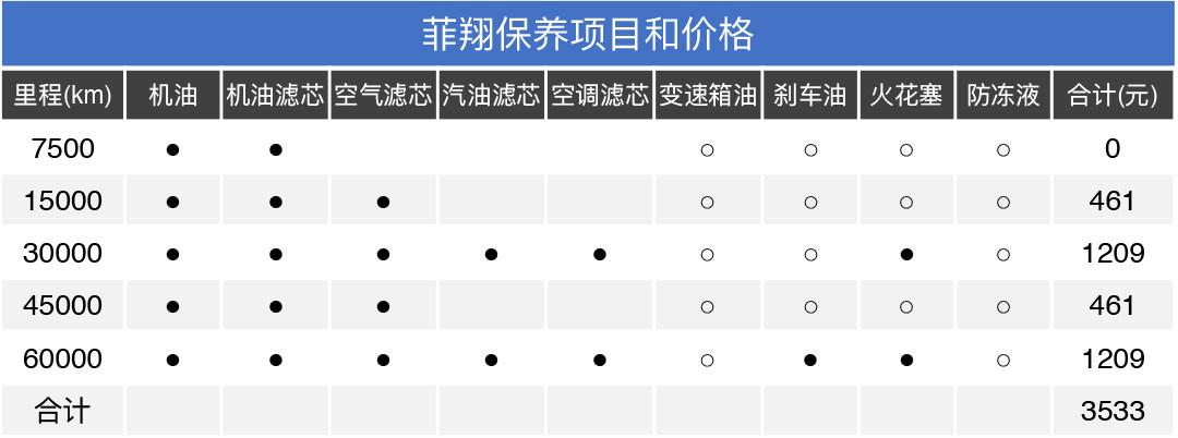 尽管卡罗拉的保值率比菲翔高,但实际上他们的保养费用并没有差太多,按照官方的保养手册,卡罗拉6万公里的保养费用为3408元,而菲翔6万公里的保养费用为3533元,两车的保养费用其实差别不大。