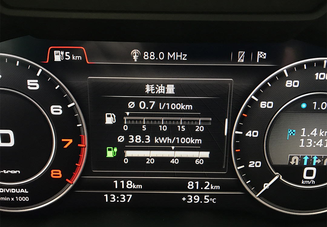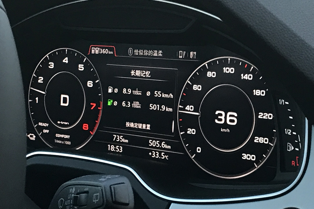 而且值得惊讶的是,在行驶了500公里后,油缸显示还有半箱油,这才是吓到教授的地方。虽然在纯电动行驶的里程仅为56km,但在混合自动模式下,你的每一次加速,低速蠕动,都伴随着电机的扭矩加成,这样就能够减少汽油发动机的负荷,从而达到省油的效果。所以如果你给我一箱油,我能让奥迪Q7 e-tron走1000公里,这个说法一点也不为过。