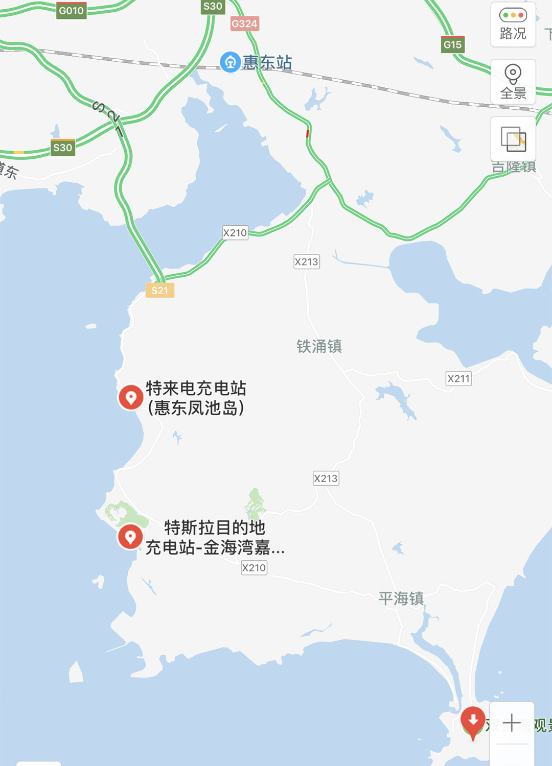 在我们的目的地惠州惠东镇,教授再次打开手机软件,查询到该景区附近也有两个充电桩地点。由于行程紧凑的关系,在后续约200多公里的回程中,奥迪Q7 e-tron将以汽油动力来驱动,整段里程中,油耗的长期记忆为8.9L/100km。这个成绩在中大型SUV里面还是可以的。