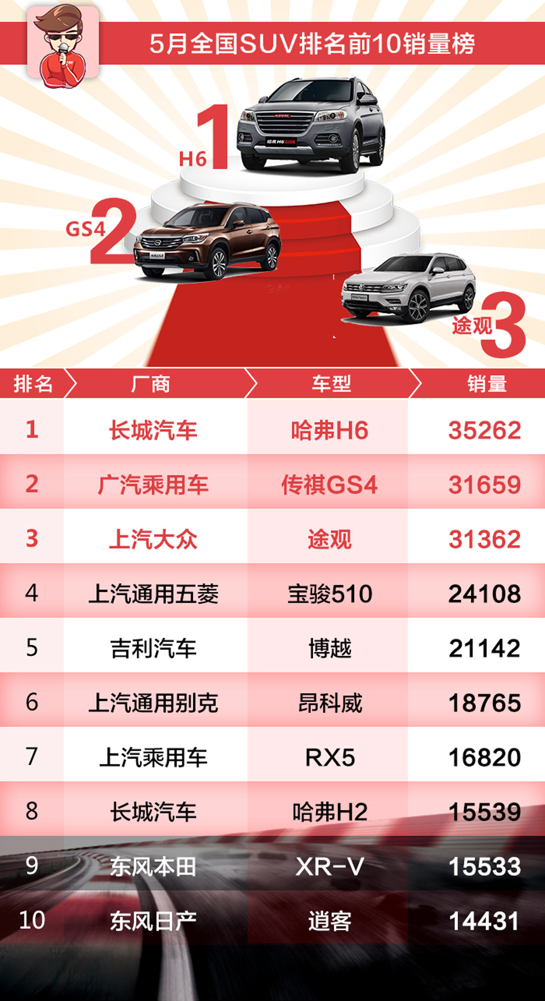 没进入前五的车型同样有看点。这个月东风本田XR-V再次以合资小型SUV的身份入围,另一款当家车型CR-V也卖出了超过1万台,再加上思域的强势表现,叫兽预测今年东本的日子应该不错。对了,全新一代CR-V也即将到来,届时20万级别SUV市场又有好戏看了。