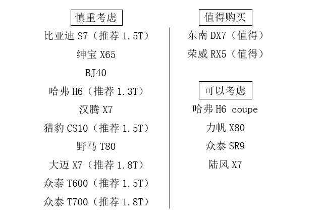 好吧,除了东南DX7和荣威RX5动力输出以及油耗综合较为良好外,其它貌似都有这或那的问题,还是那两个原因,油耗高(比如哈弗H6)加速不够快(众泰系列)!大部分10万级车型的2.0T发动机输出都一般,并且开销还特别大,可以说是一个娇贵的老婆一样,这样的车你还买吗?