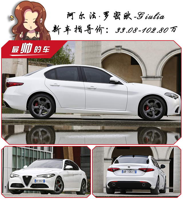 来自意大利的“帅哥”——Giulia,有着匠心的家族设计。别看它前脸那囧样,就是因为它够囧,才吸引到千千万万的粉丝。噢!其实它的前脸不叫囧样,而是“三叶草”前脸设计。O(╯□╰)o如果男人是五五身应该就算不上是帅哥,但车如果是五五身就能声称是完美的比例。一姐不能断定这样的比例是不是完美,但是看起来的确是个帅小伙。