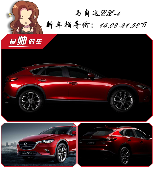 别看比起上面的几台车,马自达CX-4很便宜。但它一点都不cheap!它利用类似钻石切割手法打造的铝合金车身轮廓,远看就像闪着的一颗大钻石。还有独创的LED+水晶体发光技术,前大灯如流星般的眼睛。(又是钻石又是水晶,这分分钟在勾引啊!)至于它低宽车身比例,打造了豪华跑车般的感觉(这对于一台SUV来说应不应该我就不评价了,反正看起来帅就是了!)