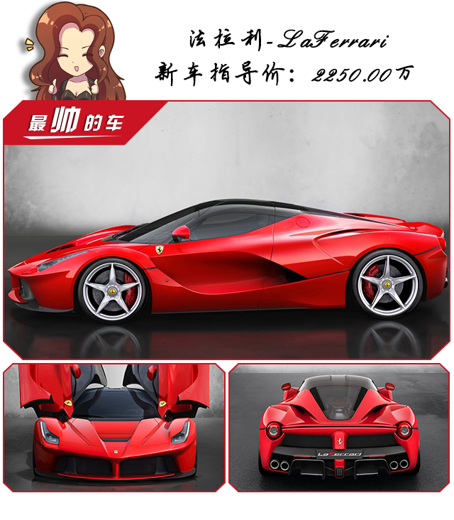 三大神车之一的LaFerrari,这不是有钱就能买到的、也不是一般人能玩得起的。而对于这样的神车,就抱着膜拜的姿态去欣赏它吧。它的设计极具很强的震撼力,无论是那下沉的前脸、蝶翼式车门,还是凹凸有致的身材。单独看每一个部分都觉得很夸张,但整体一看又是这么的完美、均衡。一姐每次看到它的时候就都被震慑住了。这样的帅,是难以超越的帅!