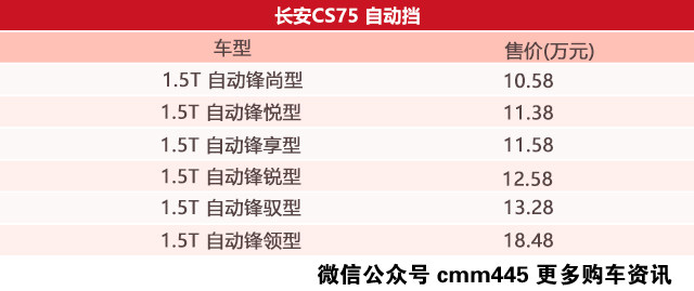 而说回今天的主角——长安CS75,在上市之初就因为自身外观以及内饰广受欢迎,搭载的是2.0L自然吸气发动机或者1.8T发动机,在不少人看来它们表现都是80分的水平,毕竟不是1.5T这个黄金排量。长安顺应时势推出了长安CS75的1.5T车型,但可惜的是没有自动挡车型,全系标配6MT手动变速箱。可幸的是,在近日长安推出了CS75 1.5T的自动挡车型,这些终于填补了自身的产品线,价格则是在10.58万起售。