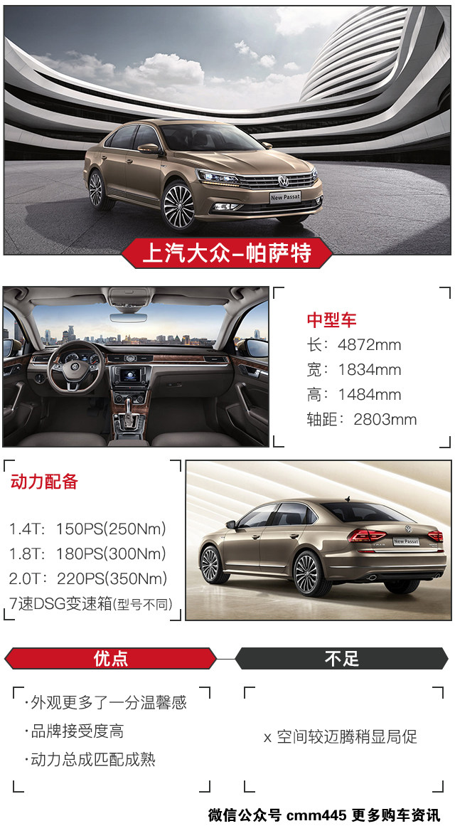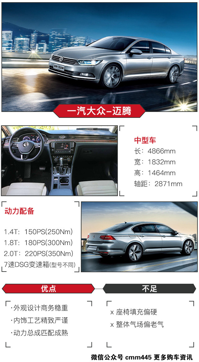 迈腾稳坐非豪华合资品牌中型车销量榜首的宝座,而它也是轿车销量总榜排行前五的重量级选手;MQB平台、EA888发动机、DQ380变速箱、三大件的出身说明这它代表着大众集团最新的科技水平;而卓尔不凡的外观设计、宽敞的车内空间、沉稳扎实的驾驶质感,也非常符合国人的购车需求,也难怪它稳坐榜首的位置。