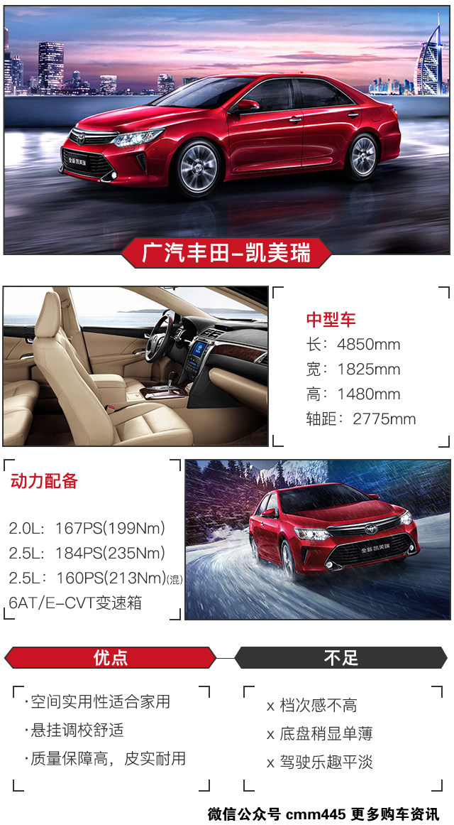 凯美瑞在外观上则显得“大叔”许多,加上表现一般般的CVT、一般般的底盘支撑,开起来凯美瑞可以说是一款没有什么特点的轿车,但是丰田最大的优势在于:“皮实”。经得起岁月磨练的品控在整个汽车界都有口皆碑。