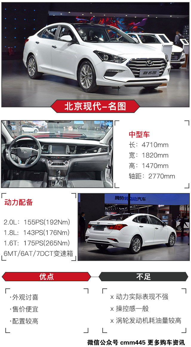 韩系车最近可是被一个导弹给彻底搞惨了,销量上唯一还能有点看头的也就剩下名图。名图这款车的最大特点在于:让人接受度高的外观设计,开上去沟通感还行的驾驶性能,以及紧凑型轿车的售价。加上个终端优惠幅度很可观,对于预算低的朋友来说确实是一个不错的选择,当然啦,要看你对于韩系车的抗拒程度是砸还是无所谓。