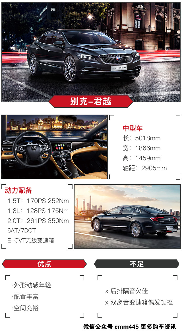 动力方面,君越搭载1.5T、1.8L混动和2.0T三款发动机,而1.5T动力输出略显疲态,且匹配的7挡双离合变速箱,平顺性有待提高。买君越更推荐2.0T车型,动力输出更强劲,且在中后段加速有着不错的动力储备。如追求更加节油效果,可选1.8L混动车型。
