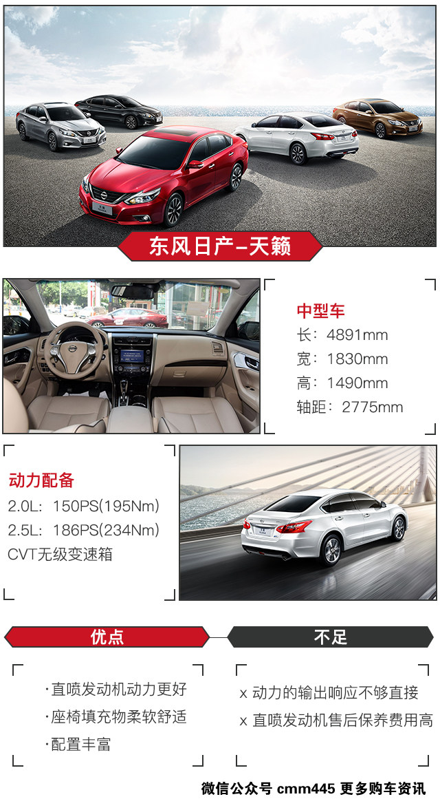 新款天籁外观设计越来越年轻化,相信受众群体也随之而扩大。不变的是乘坐舒适性依旧在同级中出类拔萃,如亲自体验过之后它的舒适程度和静谧性绝对让你出乎意料。乘坐空间足够宽阔,且座椅软硬适中够宽大,值得拥有移动大沙发的代名词。天籁共搭载2.0L和2.5L两款发动机,在配上CVT变速箱,动力输出丝般顺滑,燃油经济性也有着不错的表现,悬挂纯舒适的调校,面对大的冲击振动能从容化解,如果想要舒适性高的选天籁绝对没错。