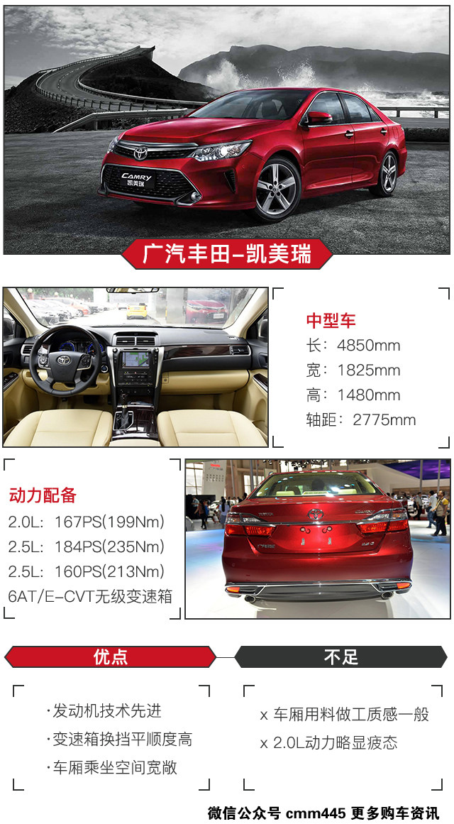 新款凯美瑞外观设计不再是中庸的风格,采用更加夸张的设计手法,在前脸设计部分上进行较大的改进,凸显了年轻运动风格。凯美瑞乘坐空间同样宽敞,即使1.8米的成年人,头部空间三指,两拳的腿部空间很宽敞,再加上皮革座椅质地柔软,让乘客有不错舒适性体验。凯美瑞搭载2.0L和2.5L以及双擎混合动力,匹配E-CVT/6AT变速箱,动力输出平顺,且有着不错的燃油经济性,当然在质量可靠性和口碑都在同级中表现属上乘。