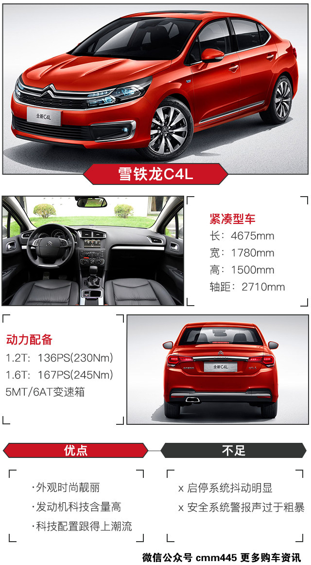 雪铁龙C4L在动力方面选择不多,搭载1.2T及1.6T两款发动机,即使是1.2T的动力数据在同排量中都属上乘水准,也有着不错燃油经济性,追去更强动力肯定首选1.6T车型。总而言之,雪铁龙C4L最大的优势就是综合实力强,无论实用性还是动力性能,它都能满足你。