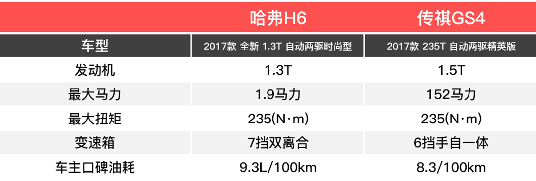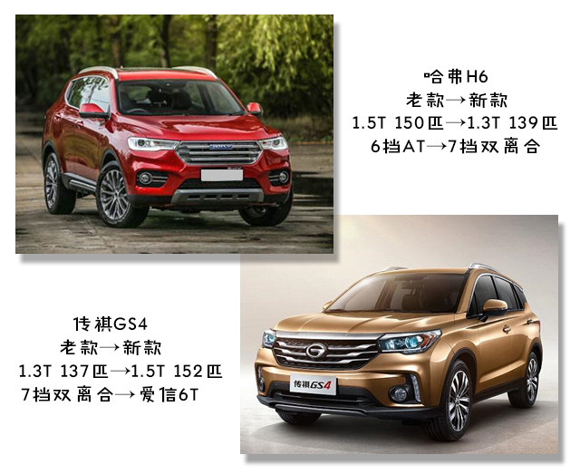 全新哈弗H6用了一款1.3T的发动机代替了曾经的1.5T,并且全系换装了来自格特拉克的7速双离合式变速箱。而GS4则在原有的1.3T发动机上,增加了一款1.5T涡轮增压发动机配爱信6AT的动力总成。