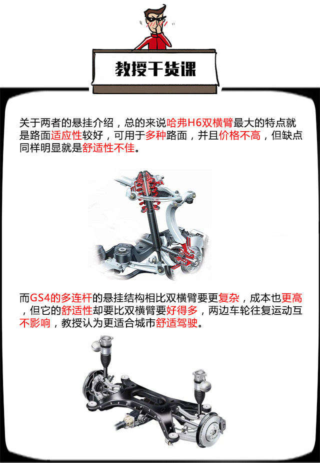 看完了发动机、变速箱,汽车三大件中还剩下底盘。全新哈弗H6采用的是双横臂的后悬挂形式,它也被称作是简化版双叉臂。而GS4则采用了更为常见的多连杆式后悬挂。