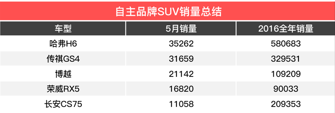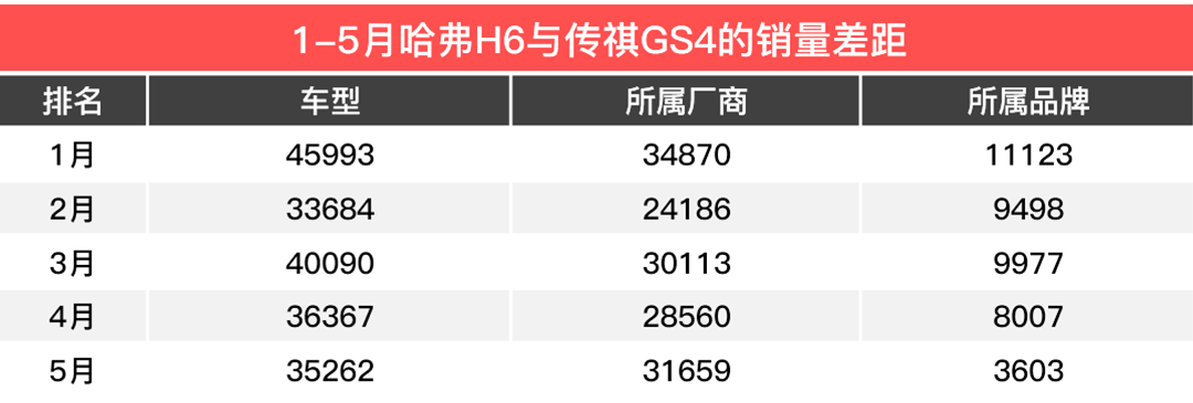 看完上表,细心的网友不难看出一些端倪。2016年哈弗H6的销量足足领先GS4 251152辆之多,但在2017年的半年时间里,GS4的表现一路看涨,甚至在刚刚过去的5月以3000辆的差距穷追于哈弗H6。