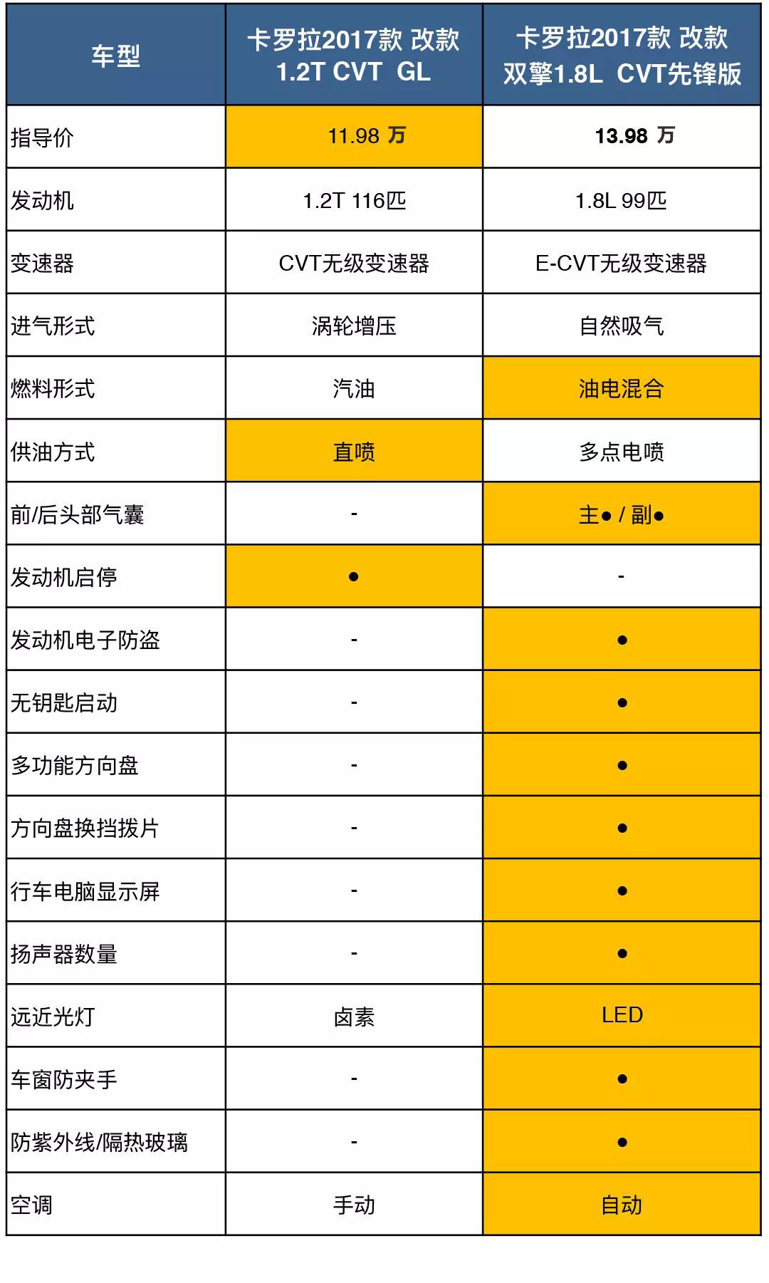 目前国内在售的合资紧凑型轿车,十来万的价位,如果你想买一台油电混合的车辆,估计只有选择丰田卡罗拉或者雷凌的双擎版了。最近丰田很火的1.2T版本也有很多人追,它拥有更强的动力,相对比自然吸气更低的油耗表现,技术成熟可靠。所以,双擎版对比1.2T版,如果除去后期养车成本的区别,究竟哪一款更值得买?