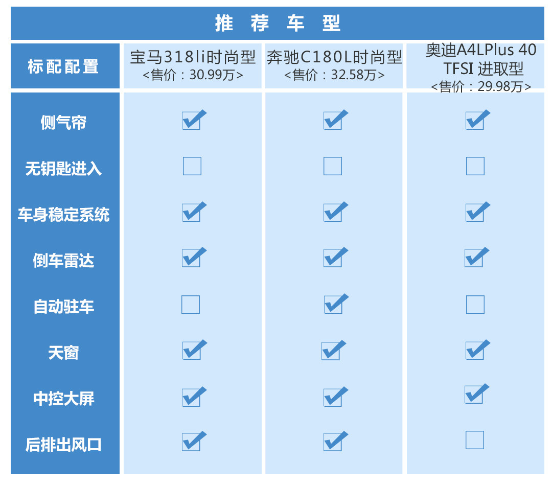 总结:入门级车型真的是低配么?可能前几年低配车更多的是为了拉低车型售价而存在的,但如今低配车已经成为走量的车型,低配车的配置基本可以满足日常的大部分需求。就像教授今天所推荐的宝马3系与奔驰C级轿车,其入门级车型与中高配车型更大的差异则来自于动力总成;奥迪A4L乞丐版配置虽然没啥亮点,但全系标配2.0T发动机是其最大的优势。虽然配置可能还是比不上同级的普通品牌,但加上品牌力,综合来看现在的B级豪车性价比绝对是杠杠的!