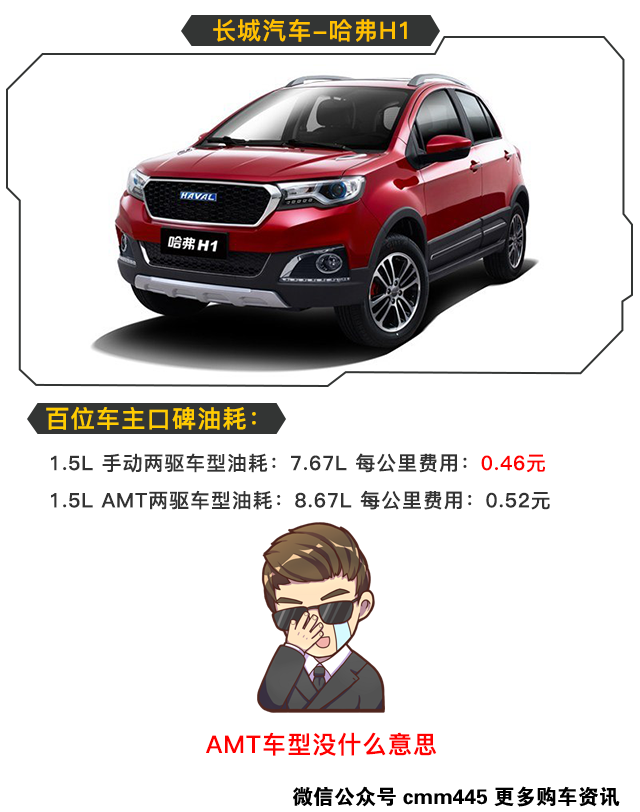 哈弗H1的油耗稍微比上面两款车型高一点点。1.5L机子推这样一款SUV,动力只能说够用。AMT变速箱的表现实在不敢恭维,换挡时的动力中断明显,而且自动模式下的换挡顿挫感明显。