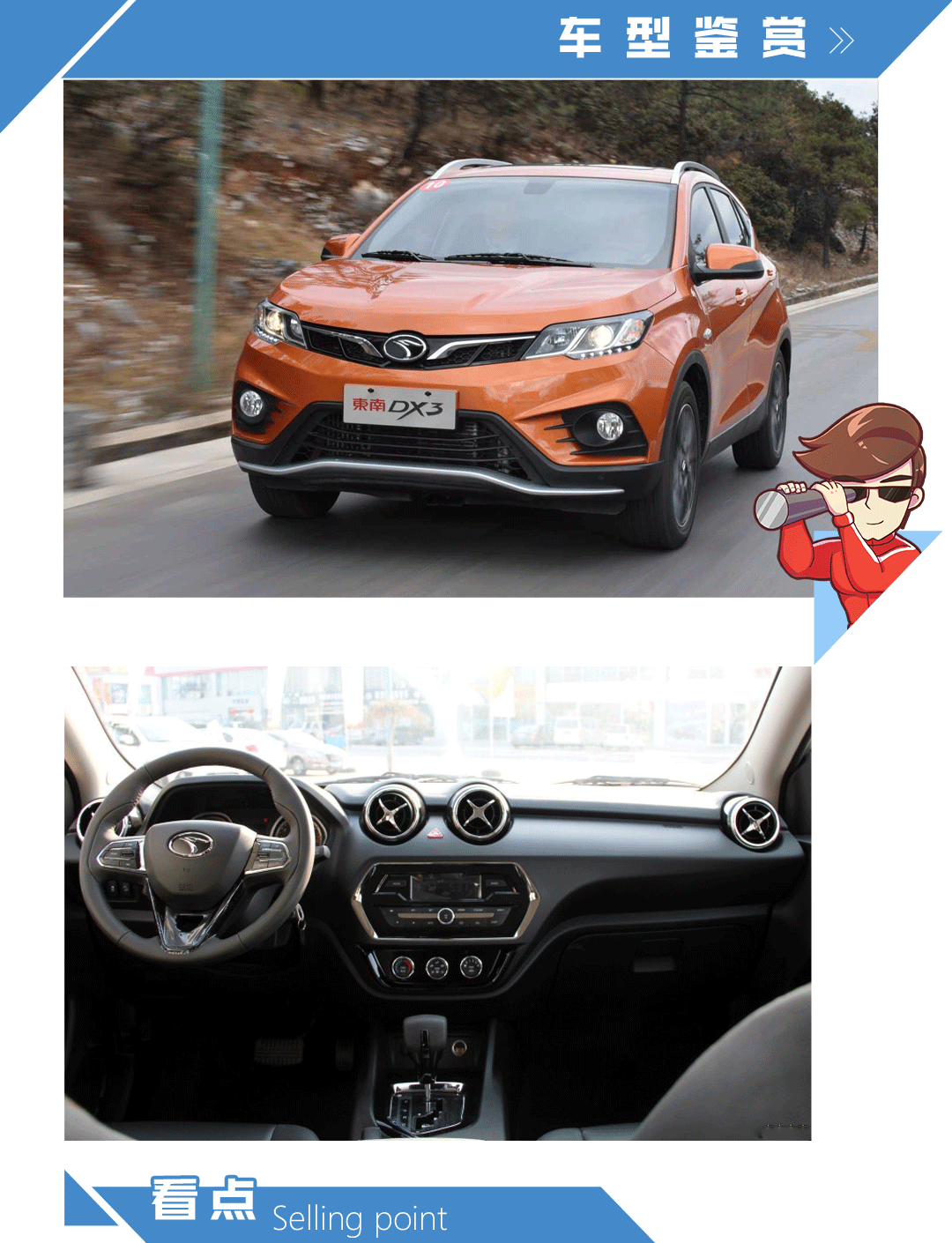 1、宾法操刀设计,东南DX3的外观造型相当年轻充满活力,教授特别推荐橙色颜色外观,特别符合年轻人的审美观;