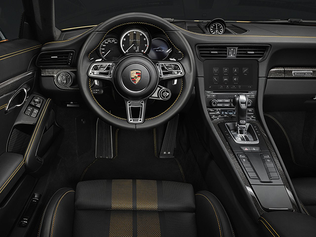 车内座椅由两层透气皮革覆盖,并辅以两条金黄色的缝线点缀,座椅头枕上同样刺有金黄色Turbo S字样,车顶则用Alcantara材质制作而成。
