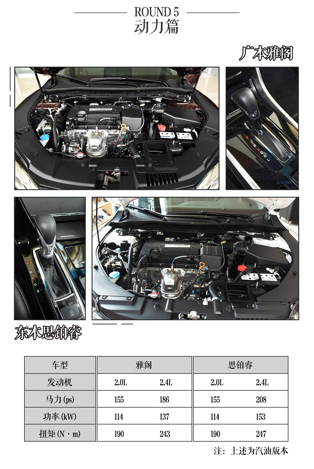 在动力方面,两款车型都搭载了2.0L、2.4L两款动力总成,但两者在调校参数上也会有所不同,主打运动的思铂睿在参数方面会比雅阁要高,而且在2.4L版本上更配备了一台8速双离合变速箱,这也是雅阁所没有的。