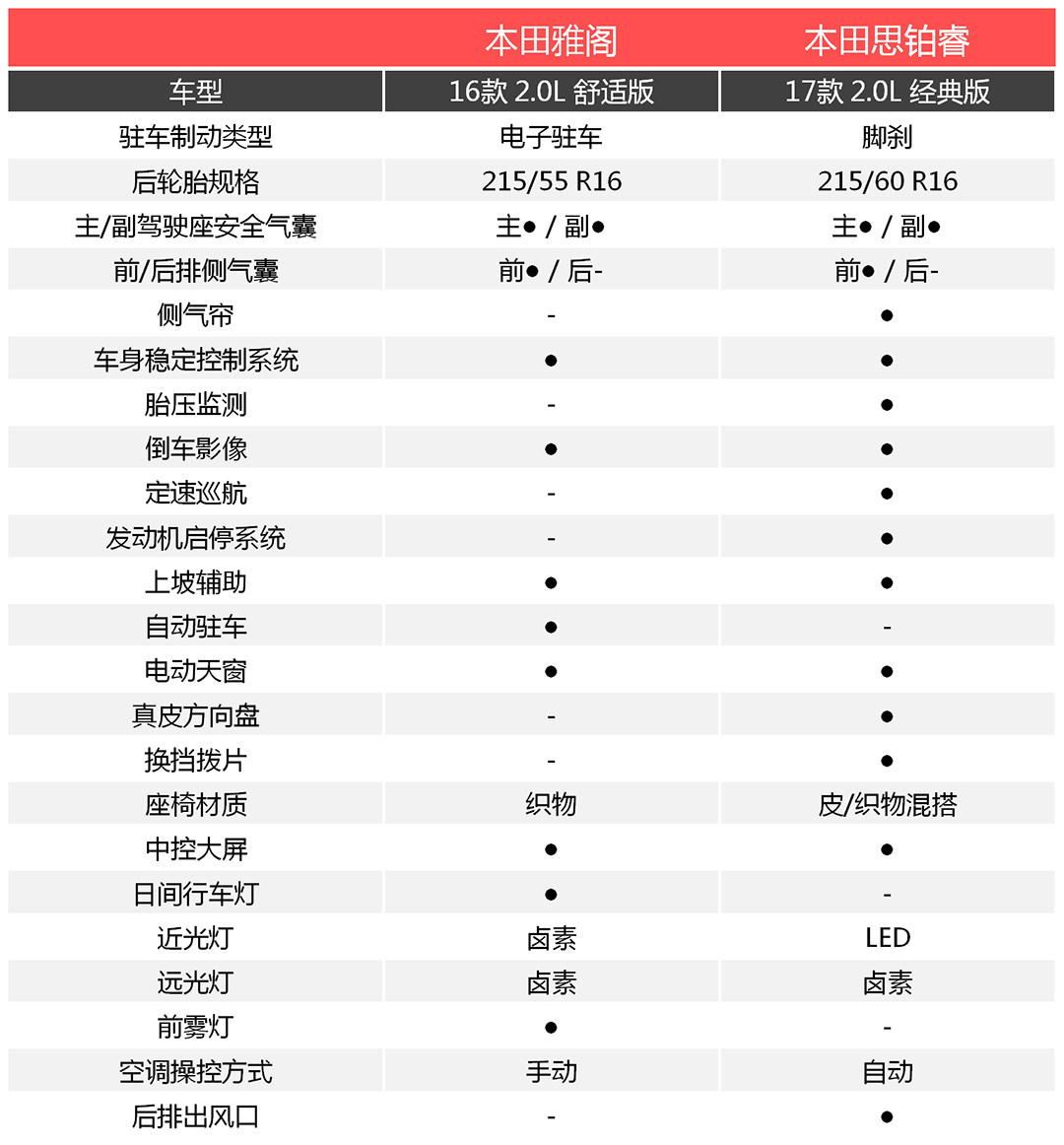 其实对于两款姐妹车型来说,在中高配两者之间的配置差距并不明显,所以我们可以来对比一下入门版的配置看谁更厚道,其实雅阁的起售价比思铂睿要低了1万元,但是你在4S店几乎买不到这个配置的车型,毕竟这个配置最主要的还是起到拉低起售价的作用。