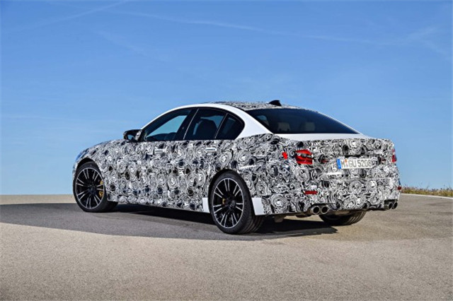 相比之下新车外观就没什么变化了。从此前宝马官方发布的一组新M5伪装车官图来看,依旧是标志性的亮黑色双肾进气格栅设计、车尾双边共四出的排气布局、多辐式运动轮毂等等。