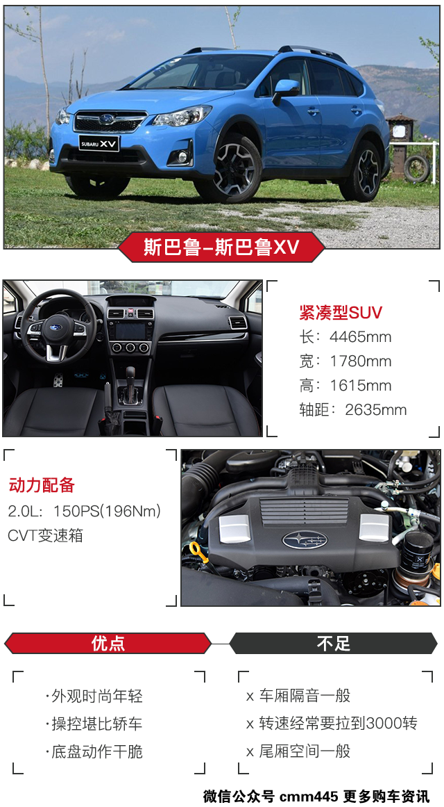 斯巴鲁全系车型都为进口,而XV也毫不例外,不到19万的起售价,你就能获得全进口的品质,以及低重心带来不错的操控乐趣,且拥有不错的燃油经济性。其不足就是CVT变速箱加速不算强劲、内饰不够豪华,虽然有高离地间隙和全时四驱,这并非就是硬派越野SUV车型。