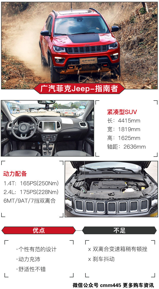 指南者即使是搭载自由侠上那套被人吐糟的双离合变速箱(低速顿挫明显),但指南者在匹配方面做了许多的优化,驾驶质感平顺且舒适。新指南者的四驱车型搭载同级唯一带低速扭矩放大的智能四驱系统,遗憾的是并没全系标配,只有顶配车型才有所配备。如果你对越野有追求并且有一定的Jeep情怀,那么24万顶配车型就是强悍的越野车了。