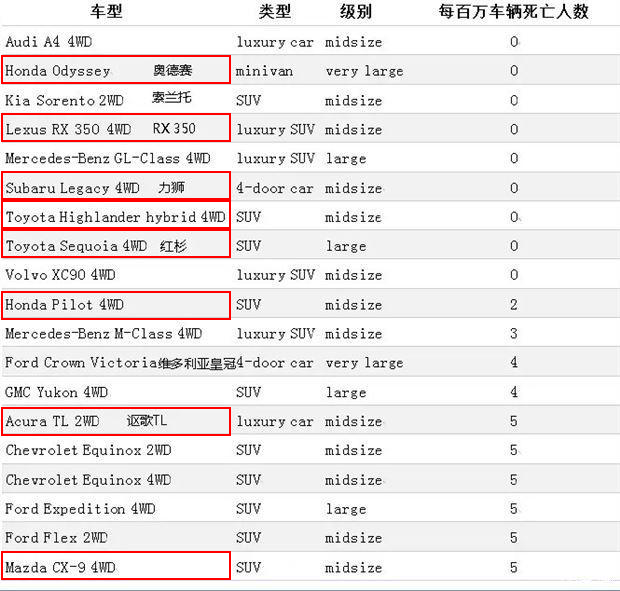 IIHS公布的19款死亡率最低的车型↑↑↑