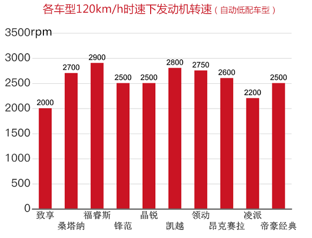 那么CVT节油效果有多么明显呢?还是要搬出前期咱们测试丰田致享时的数据,60km/h速度巡航时转速仅仅1100转,80km/h速度巡航时转速仅仅1400转,120km/h时也只有2000转而已,相比之下同级对手在节油效果上十分明显。