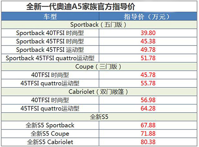 奥迪A5在诞生之初,就定位于入门级轿跑,一直肩负着奥迪运动基因传播的使命。而在初代A5推出10年后,我们终于等来了代号B9的继任者:2017年6月30日,全新奥迪A5家族在浙江乌镇互联网国际会展中心正式上市,本次上市共11款不同配置车型,涵盖了全新奥迪A5 / S5 Coupé双门轿跑、全新奥迪A5 / S5 Sportback 四门轿跑、全新奥迪A5 / S5 Cabriolet敞篷轿跑,价格区间为39.80万元至80.38万元
