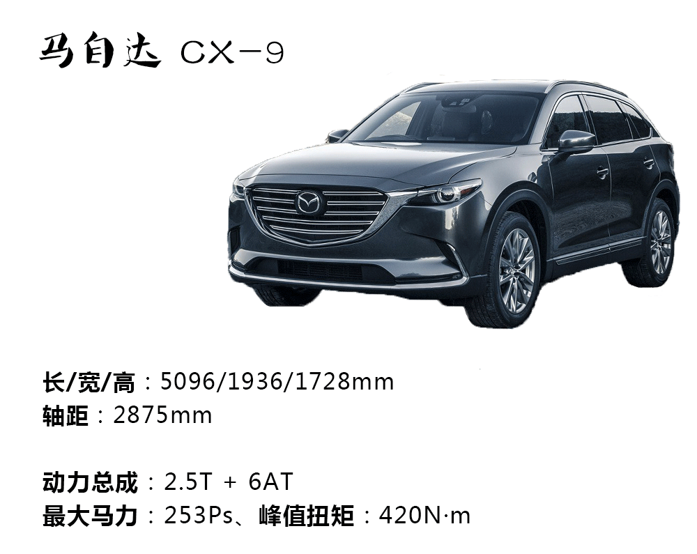 亮点:日本广岛工厂生产;创驰蓝天2.5T直喷发动机;7座布局;梨花木和Nappa真皮内饰;缸盖集成式排气歧管,带外置水冷EGR。